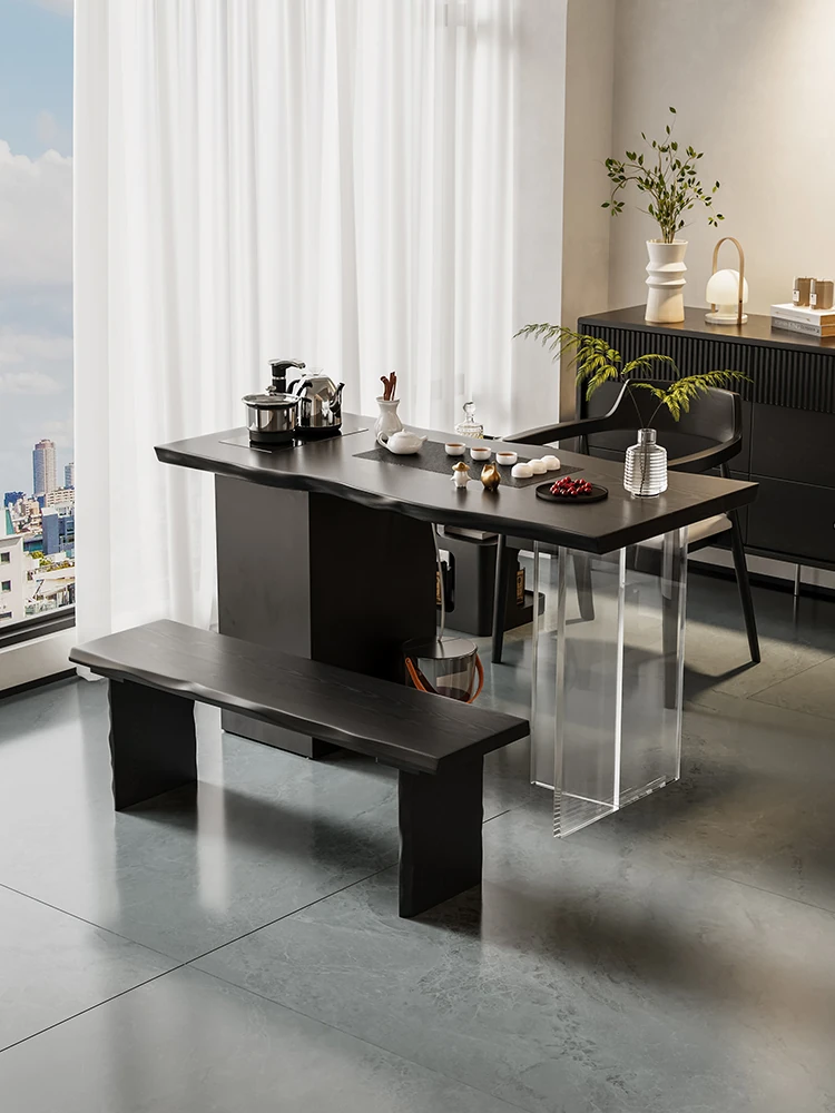 モダンなシンプルデザインの無垢材大板茶卓セット - 和の美を感じるアクリル製の自然木茶台、リビングルームに最適な家庭用テーブル。心安らぐ侘寂の空間を演出します!