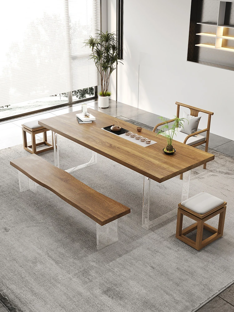Modern Minimalist Solid Wood Acrylic Floating Tea Table and Chair Set - Rustic Large Board for Home Living Room, Embracing Wabi-Sabi Aesthetics