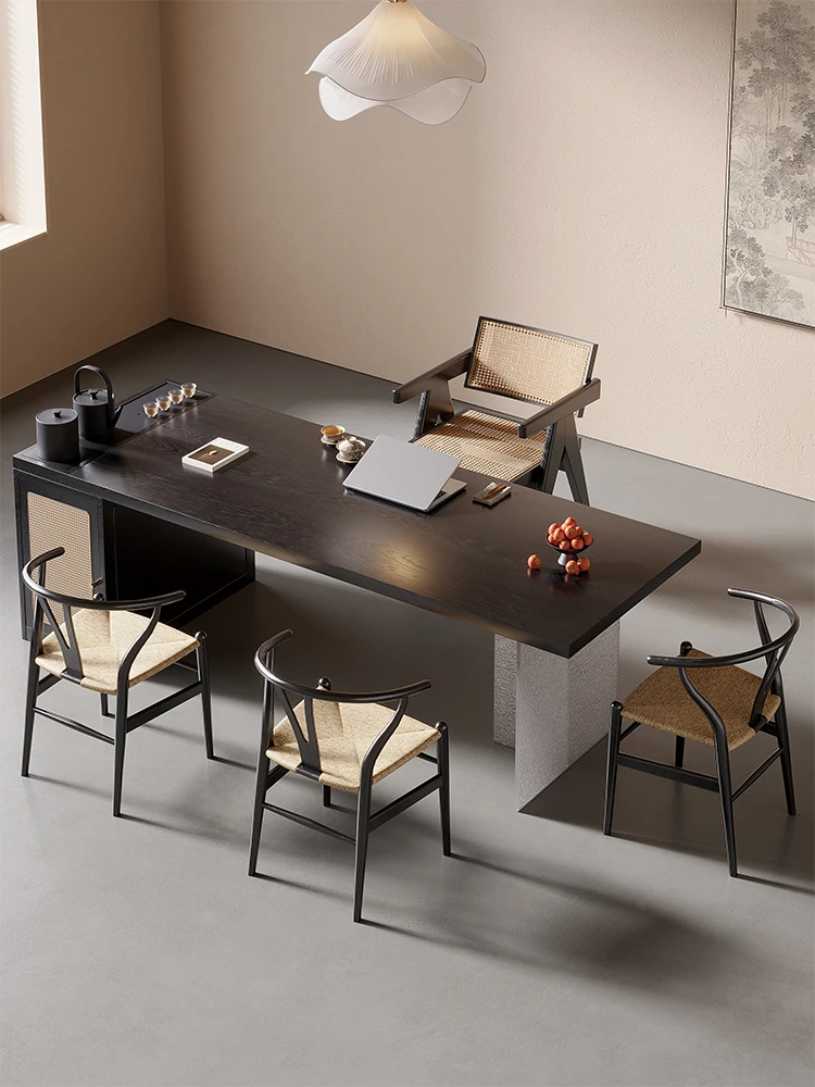 Zen-Inspired Wabi-Sabi Rattan and Solid Wood Tea Table and Chair Set - Modern Minimalist Design for Home Tea Brewing with Natural Large Wood Slab