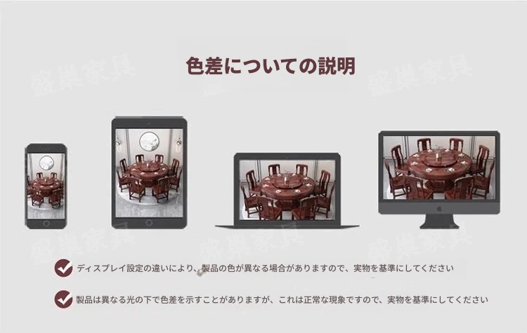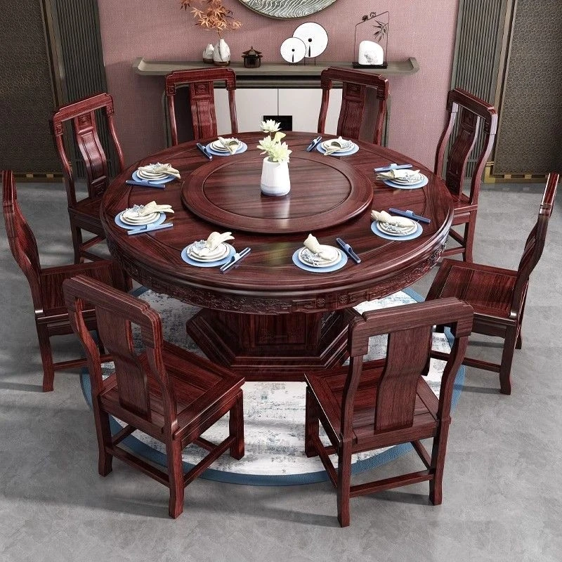 新中式デザインのインドネシア産紫檀材使用!豪華な赤褐色の実木ダイニングテーブル、回転式椅子付き。美しい彫刻と伝統的な榫卯構造で、家族や友人との食事時間を特別に彩ります。