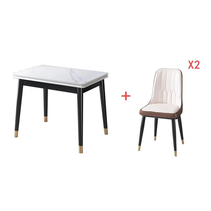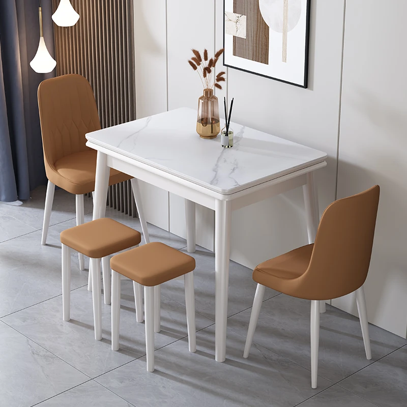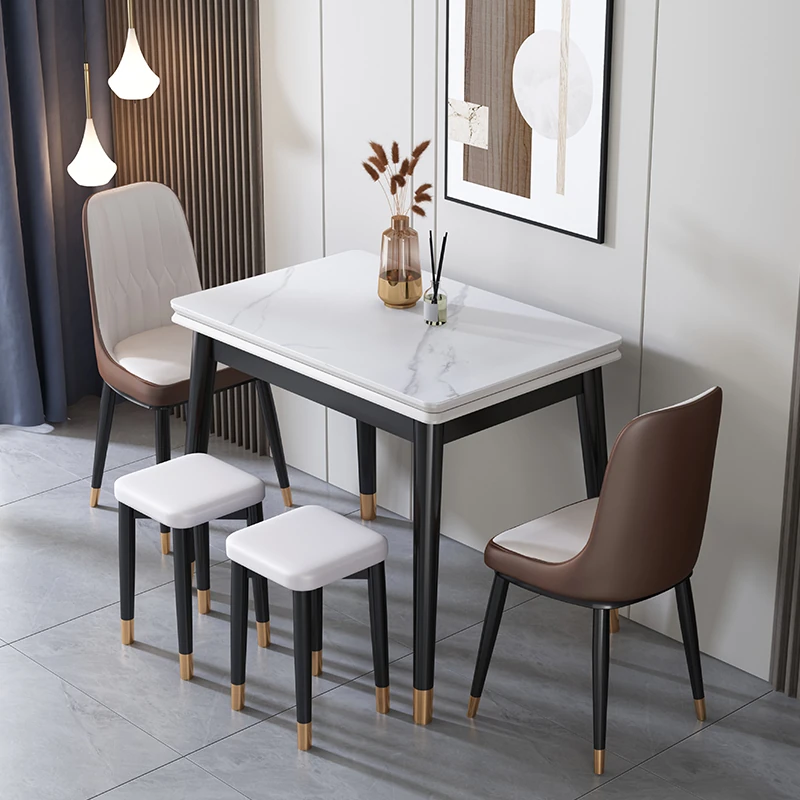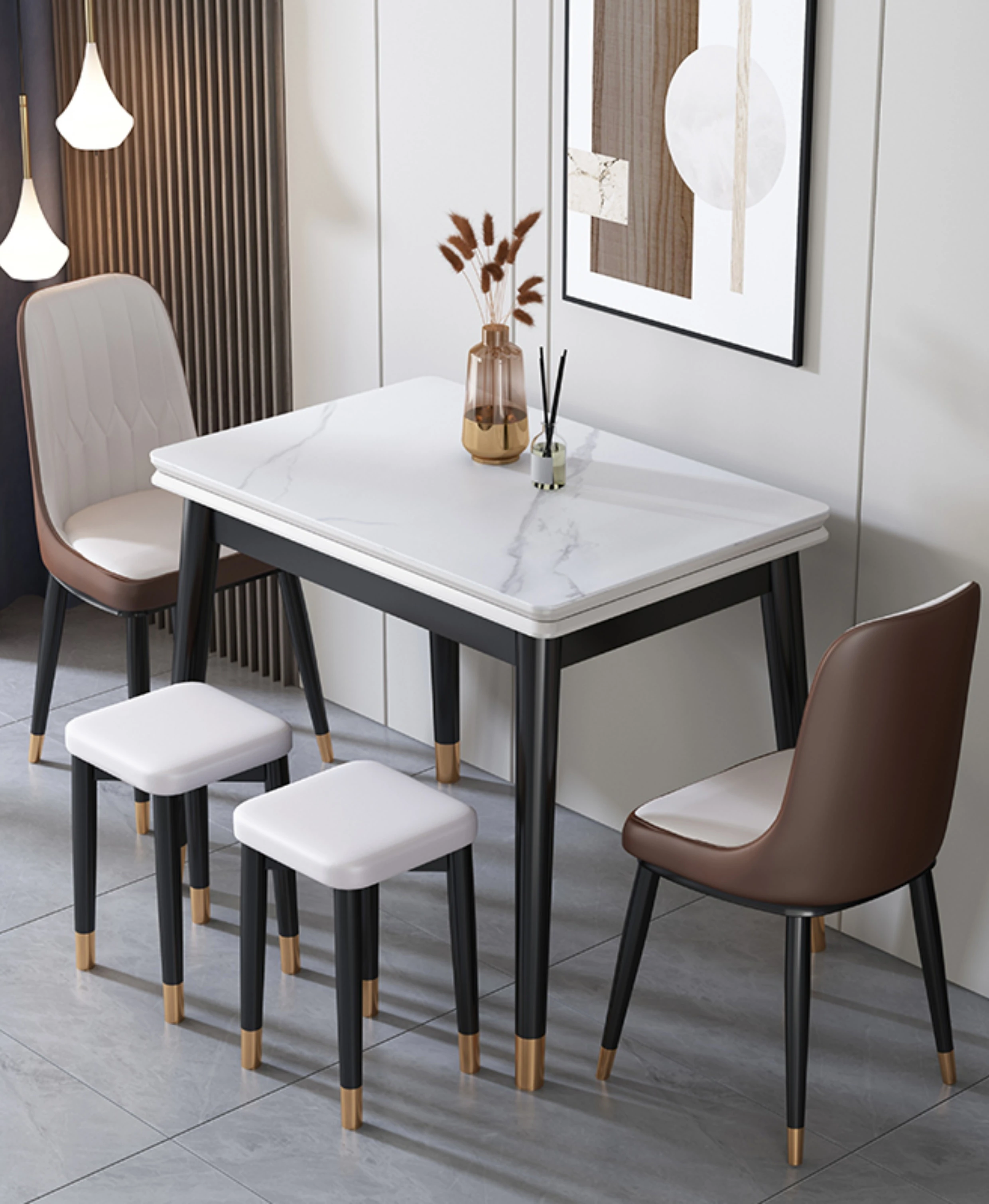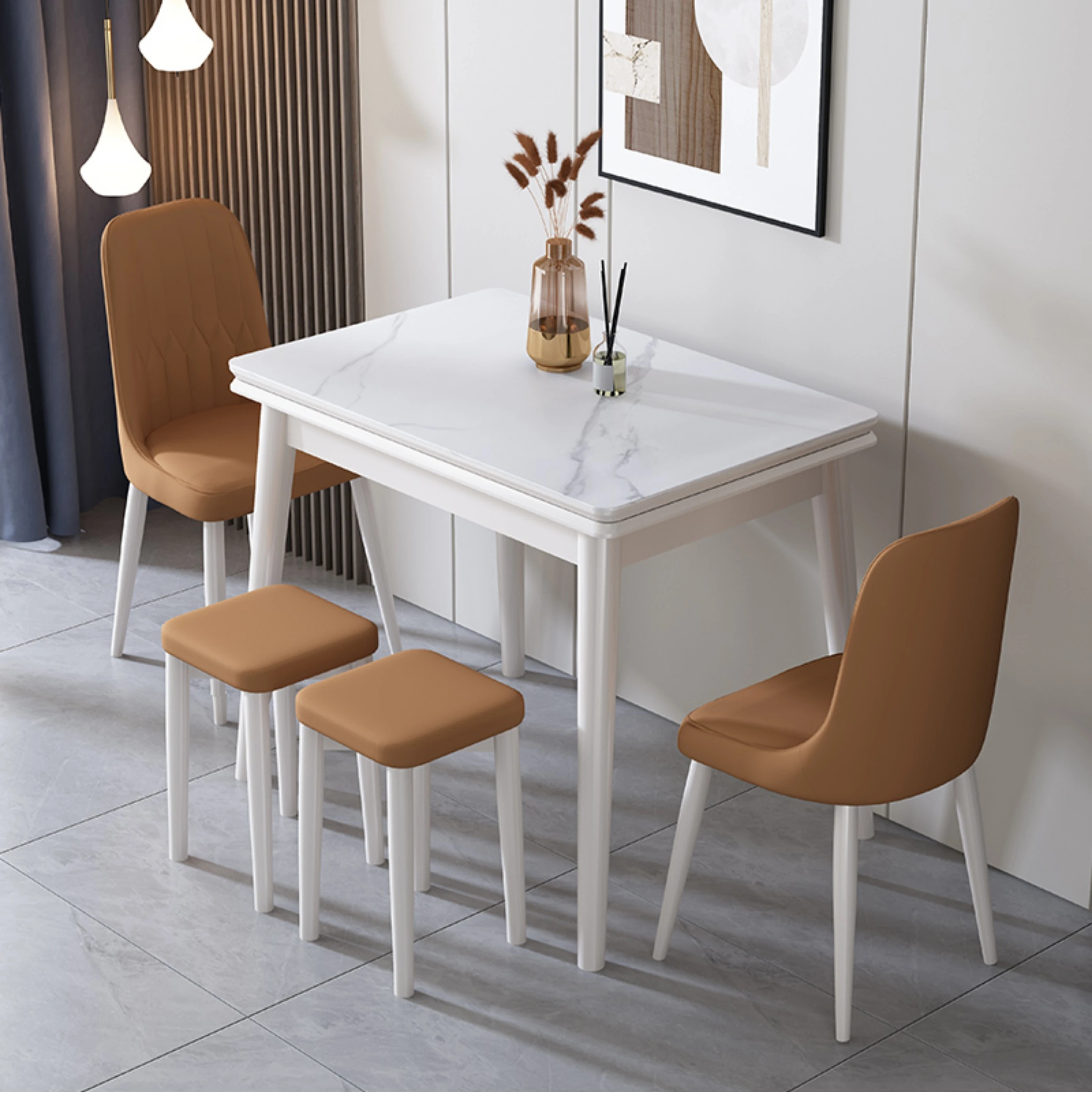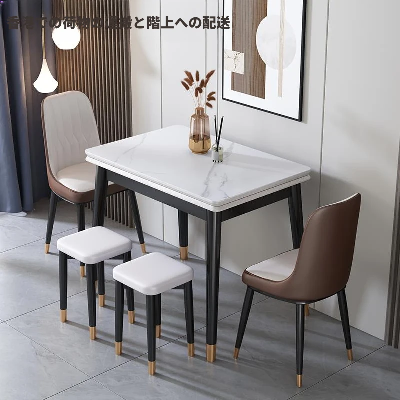 岩板折りたたみダイニングテーブル+2椅子2スツール(ブラウンホワイト)