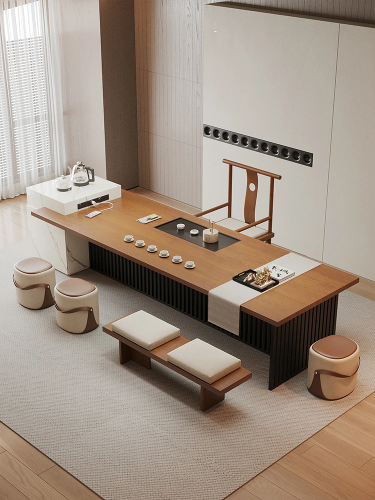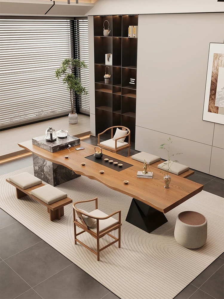 吉赠実木岩板茶卓椅子セット - モダン軽豪華なリビングルーム用、2025年新作の高級新中式デザイン。おしゃれで機能的な茶台で、心地よいティータイムをお楽しみください!