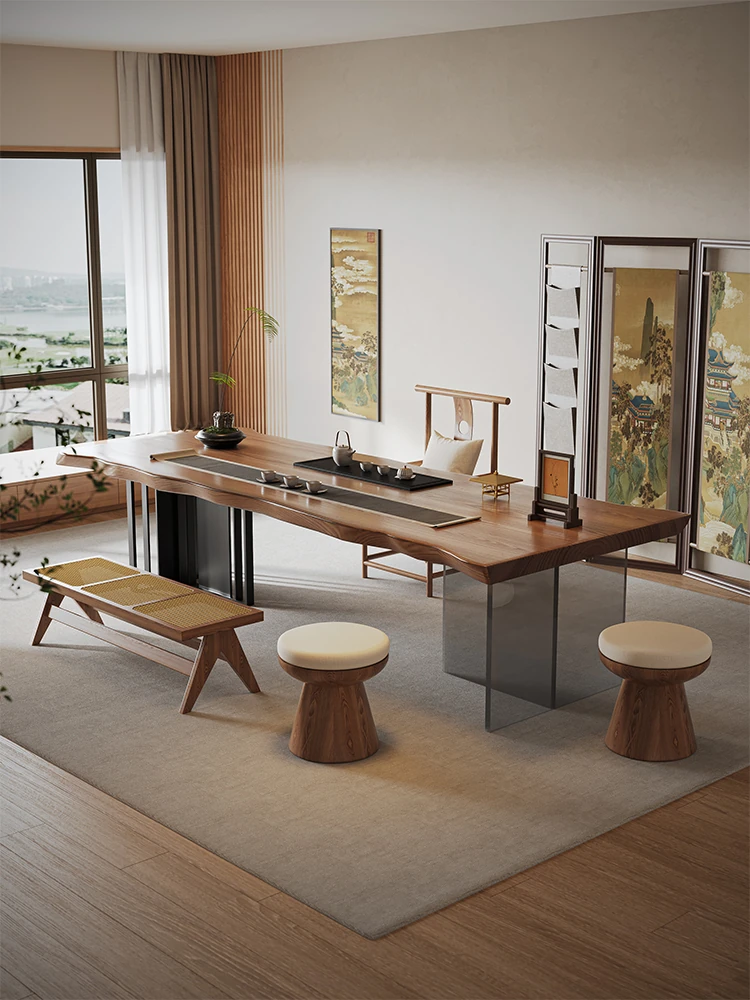 高級感あふれるシンプルな無垢材の大板テーブル&チェアセット 2025年新作!リビングやオフィスにぴったりなティーサロンスタイルの茶卓で、くつろぎのひとときをお楽しみください。
