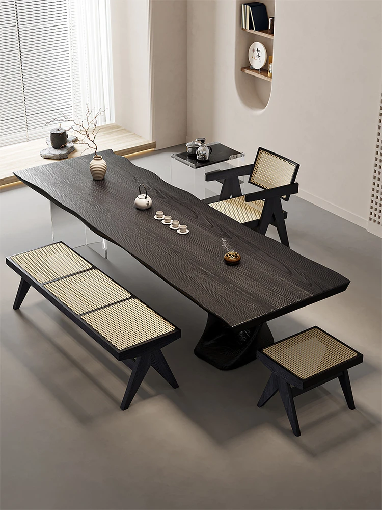 吉赠イタリアンミニマリストデザインの無垢材大板茶卓椅子セット - 新型侘寂スタイルのブラックティーテーブル、2025年新作登場!シンプルで洗練された美しさをお楽しみください。